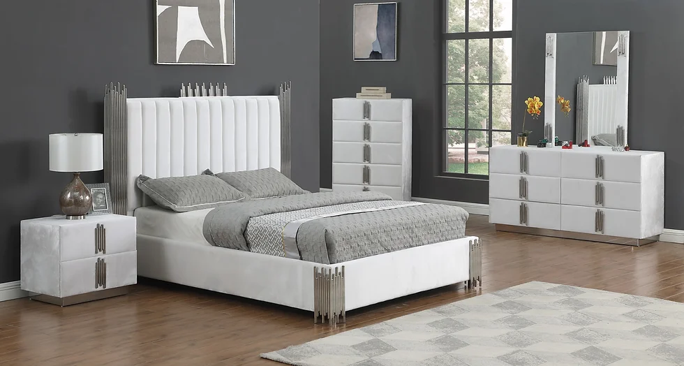 • Headboard: Adorned with white velvet for a sophisticated look.