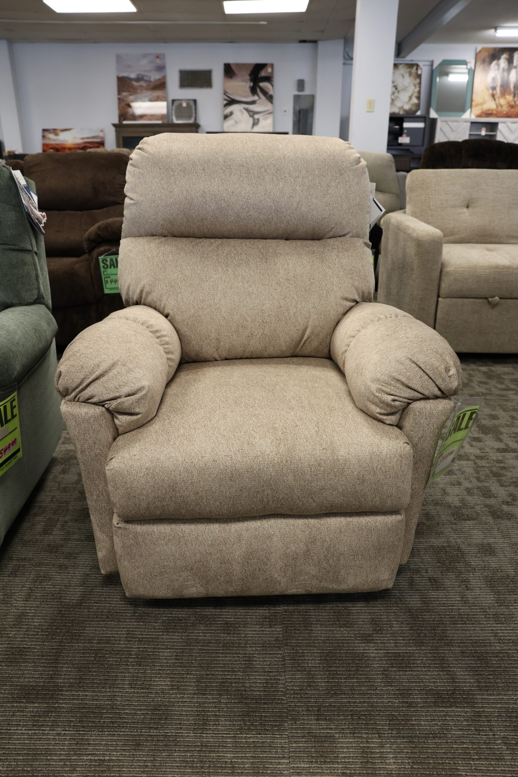 Enjoy timeless relaxation with this ultra-cozy recliner upholstered in a soft, durable light beige fabric. Overstuffed cushions and rounded pillow arms provide the perfect mix of comfort and support—ideal for reading, napping, or movie nights.