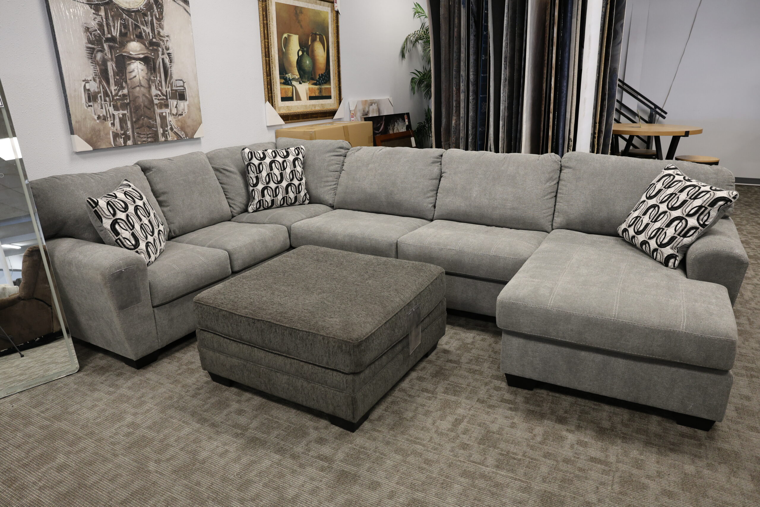 This sleek and versatile sectional offers spacious seating wrapped in soft, cool grey upholstery — perfect for modern homes and family spaces. Featuring a right-facing chaise and oversized square ottoman, this set gives you flexible lounging and entertaining options.