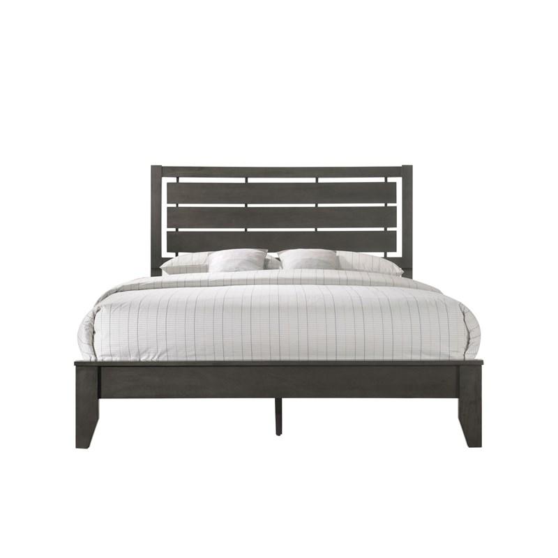 Embrace the sleek allure of its grey finish, adding a touch of understated elegance to your space. The horizontal slat-style headboard and tapered legs exude contemporary charm, while the solid wood construction ensures durability and longevity.