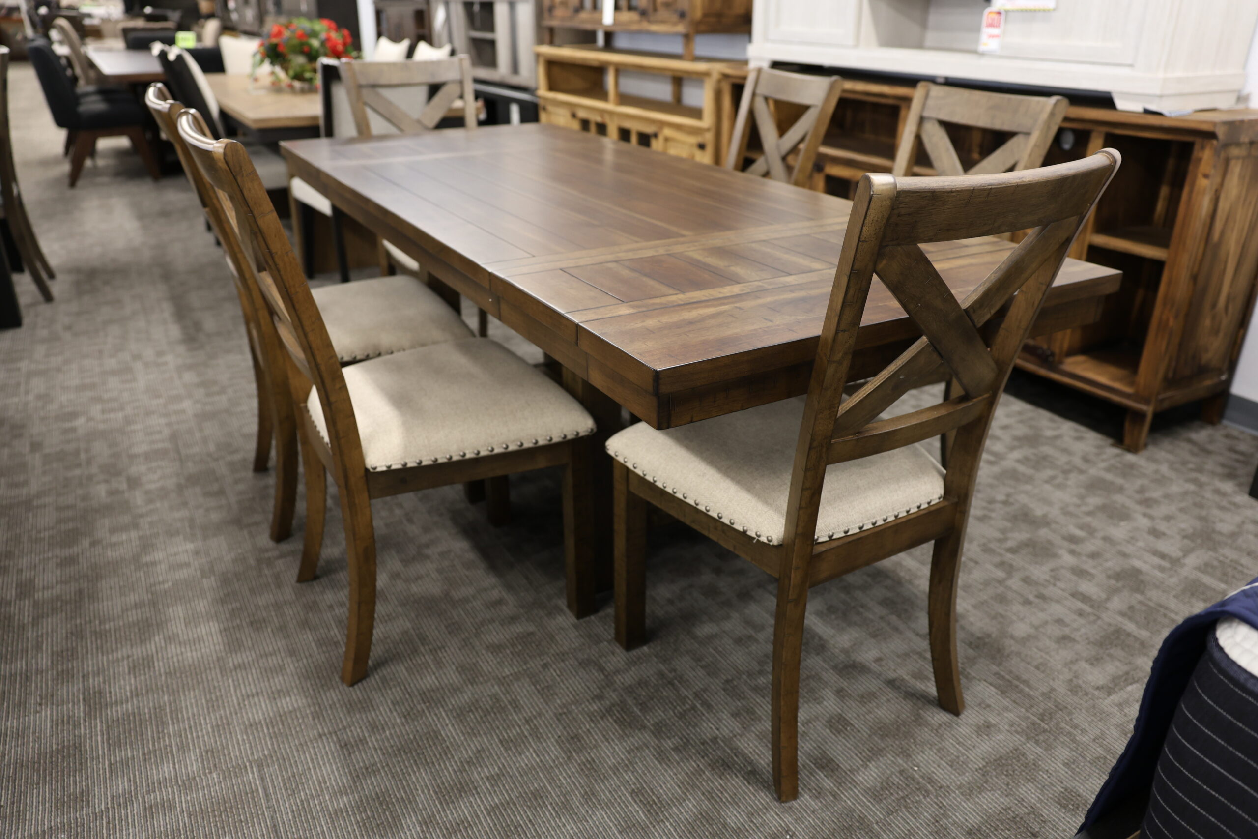This 7-piece dining set combines rustic elegance with modern practicality. The rectangular table features a beautifully detailed plank-style top, paired with six classic X-back chairs upholstered in a neutral linen-style fabric and accented with nailhead trim.