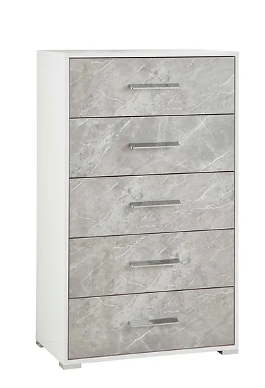 Introducing the Marlene Modern Italian Bedroom Furniture Collection, a stunning ensemble finished in a beautiful combination of white gloss and grey stone effect. This Italian bed frame is adorned with stylish LED lighting on the headboard, adding a touch of sophistication to your bedroom. With chrome handles and feet on the chest of drawers, the Marlene Italian Bedroom Set boasts a fantastic contemporary look that will complement or transform most modern bedrooms, suiting a variety of different decors with ease.