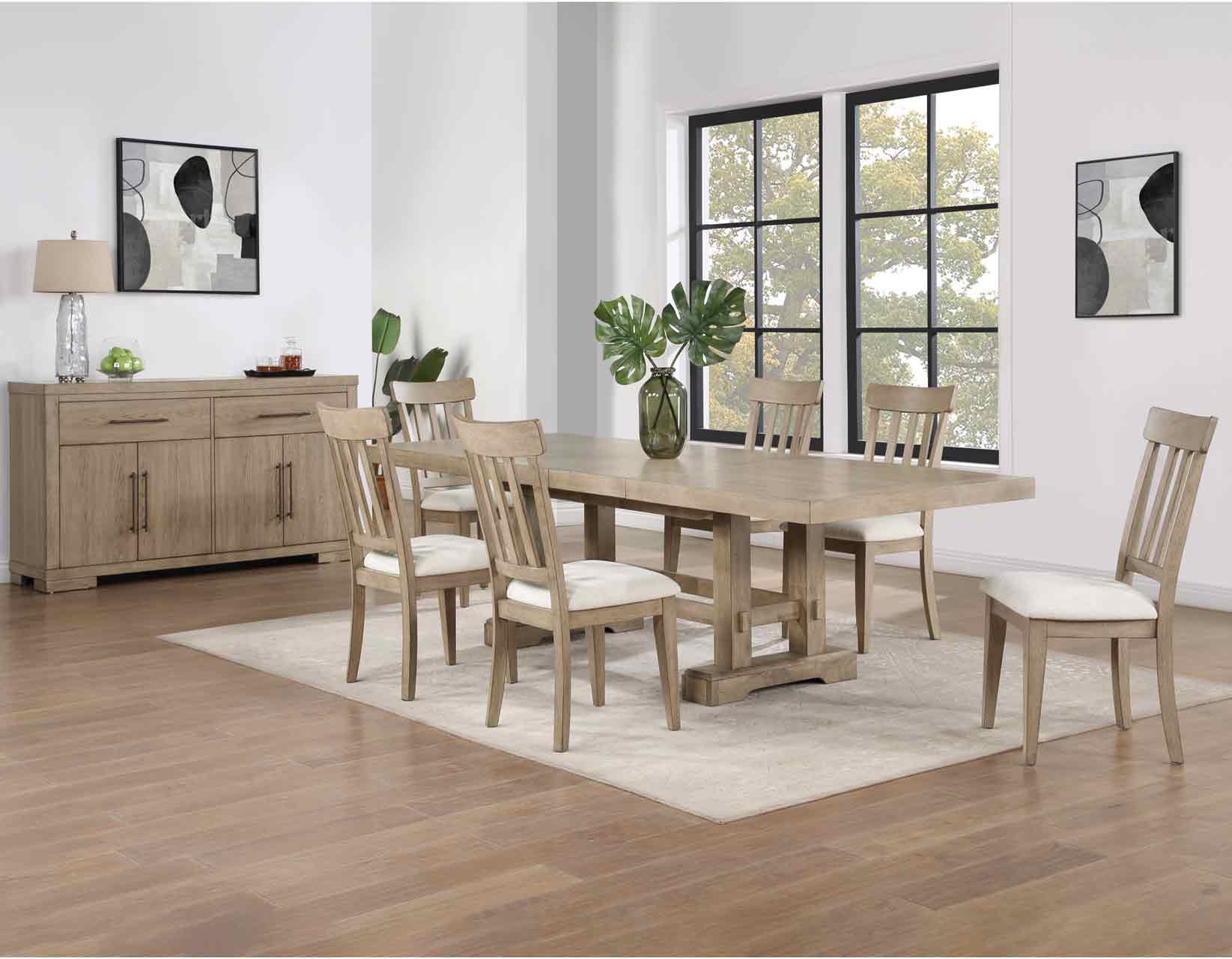 The Napa Dining Set in Sand color brings a grand California casual style to your dining room. Featuring a plank-effect top and two 18-inch leaves, it accommodates up to ten people, making it perfect for large gatherings. The light and airy weathered sand finish gives the set a soft, inviting look that blends seamlessly with a variety of décor styles.