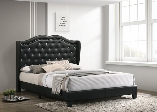 Description: Faux Leather Black Platform Bed featuring Diamond Tufted Headboard with Silver Nail head Trim.