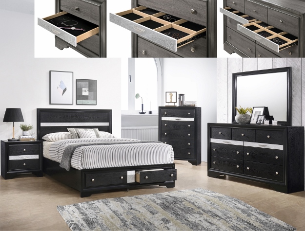 | B4670-2 | REGATA NIGHT STAND BLACK/SILVE | Item : 26″ X 16.5″ X 26″H WITH JEWELRY TRY – CENTRE GLIDE Assembled : 16.54″ X 25.98″ X 25.98″ |