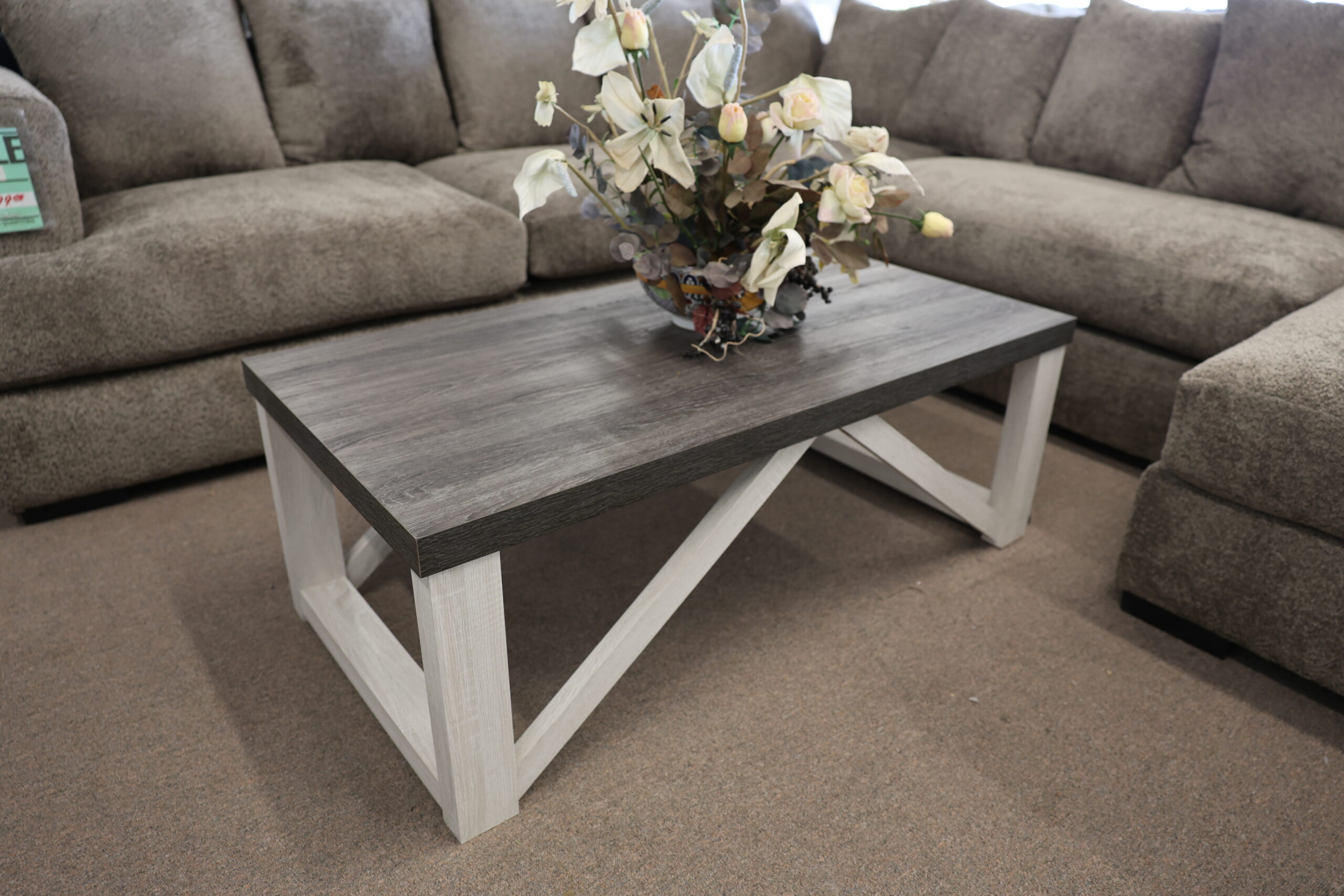 This rustic coffee table blends form and function with a weathered gray wood top and contrasting whitewashed base. Its geometric leg design adds a modern touch to a classic farmhouse silhouette—perfect for anchoring your living room with warmth and charm.