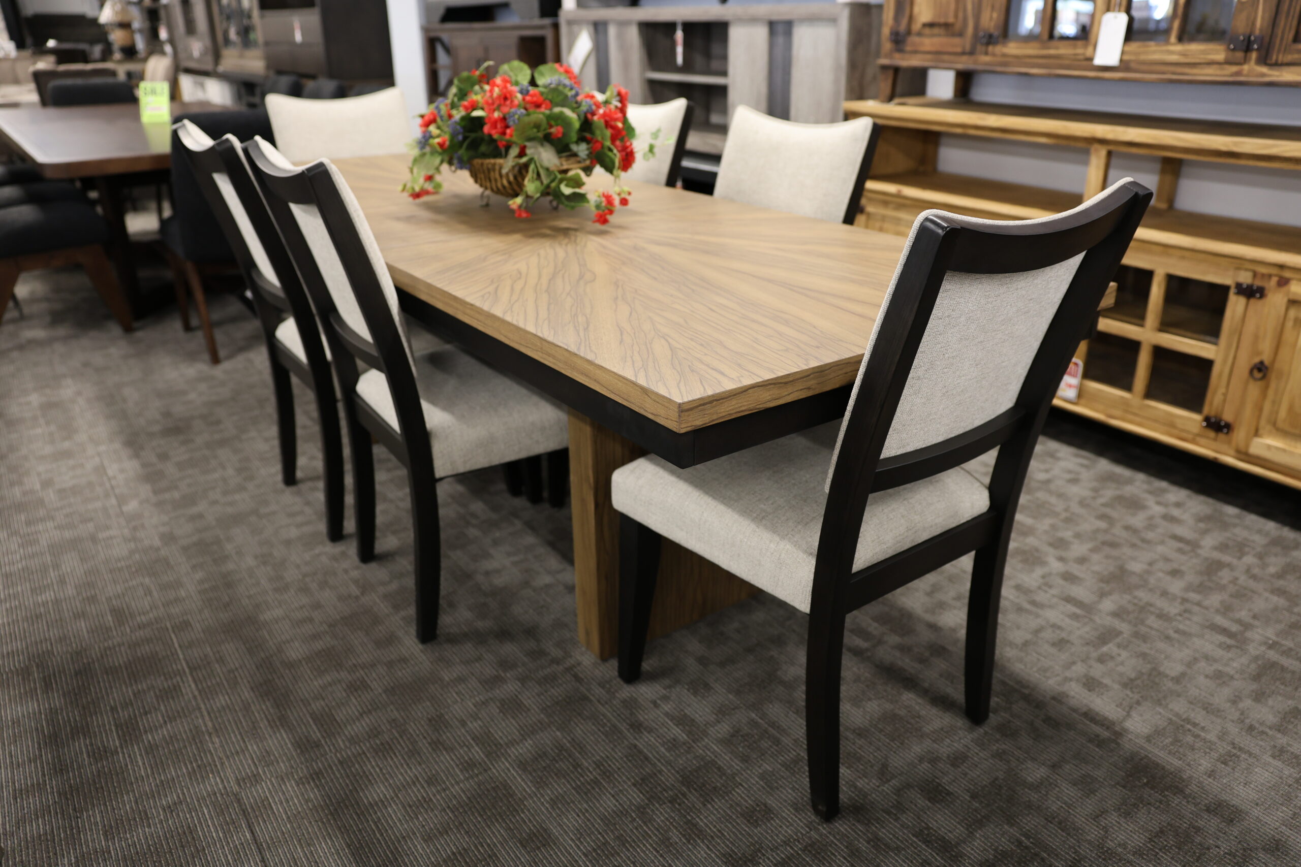 The Sierra Dining Set blends warm natural wood tones with modern lines for a sophisticated yet inviting dining space. The rectangular table features a thick, angled woodgrain top supported by a solid pedestal base, while the high-back chairs offer contrast with black framing and soft cream upholstery for comfort and style.
